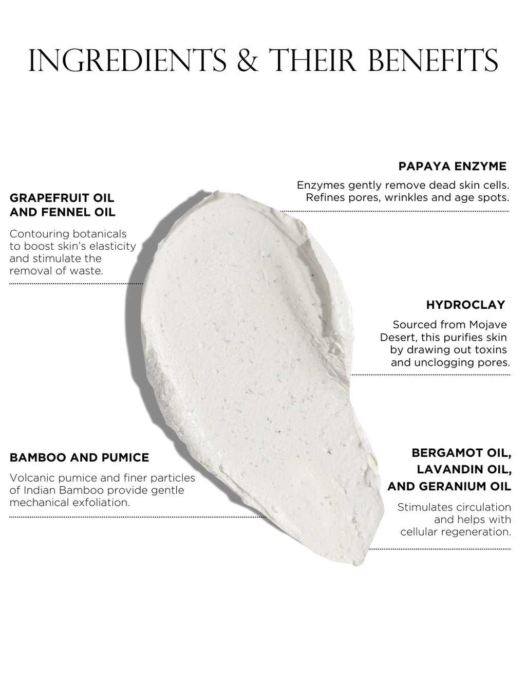 First, Fermented Papaya Enzyme gently breaks down dead skin cells, allowing penetrating, cleansing Hydroclay to lift and eliminate deep-set impurities. Unlike many abrasive body scrubs, the light, aerated texture of Olverum Body Polish provides a comforting cushioning effect for intensive massage, which maximises the effects of mechanical exfoliants Bamboo and Pumice to polish the skin to a satin finish.